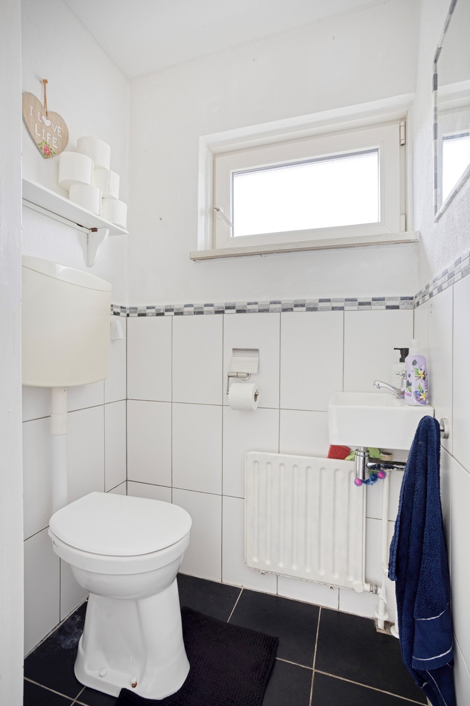 Via de voortuin en oprit kom je binnen in de hal, waar zich de toiletruimte, de trap naar boven en de doorgang naar de woonkamer bevinden.