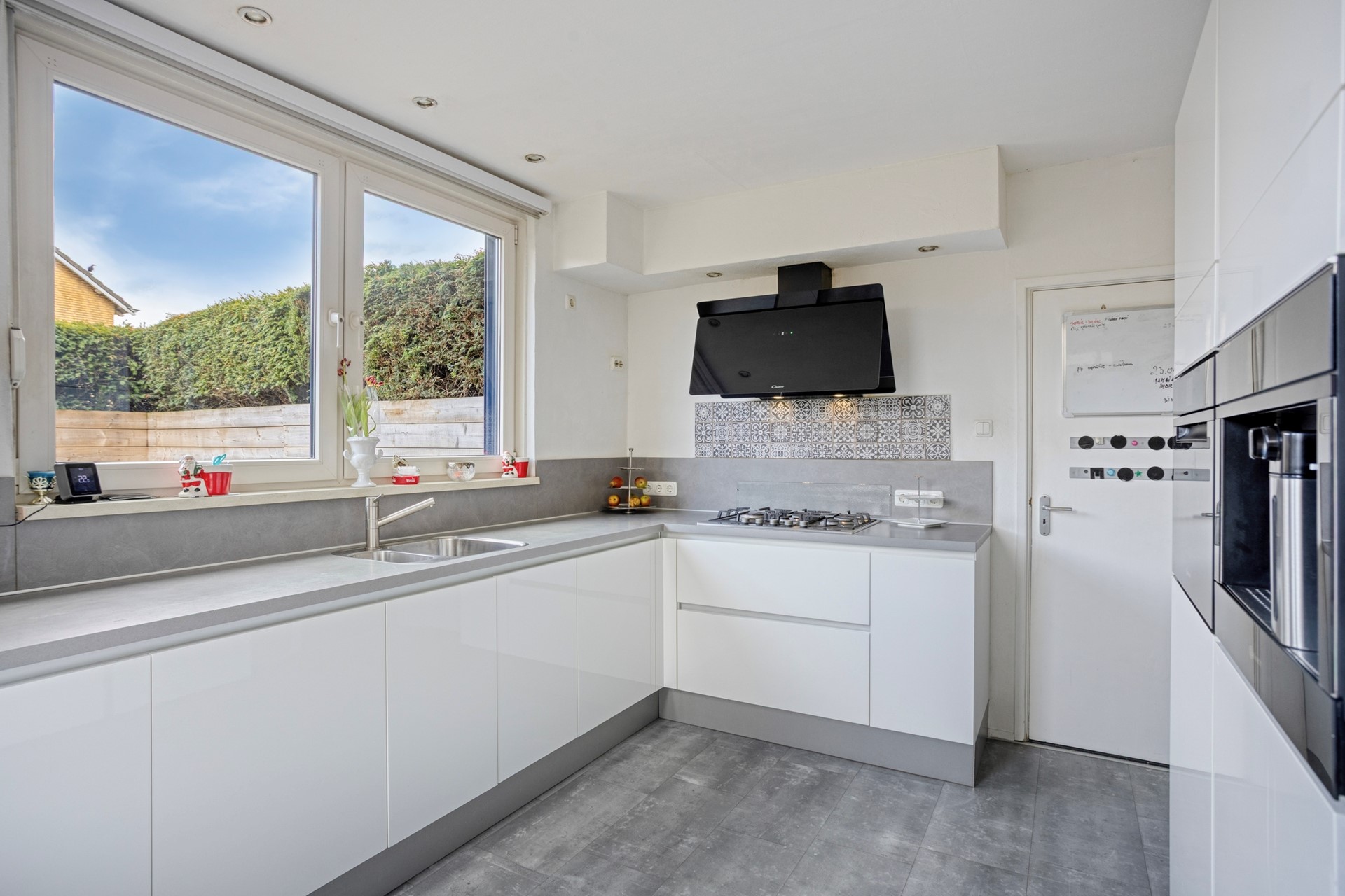 Aan de achterzijde bevindt zich de keuken in een moderne hoekopstelling. Deze is voorzien van een gaskookplaat, afzuigkap, combi-oven, koffiemachine en vaatwasser. De indeling is praktisch en biedt voldoende werk- en bergruimte. Vanuit de keuken heb je directe toegang tot de tuin.