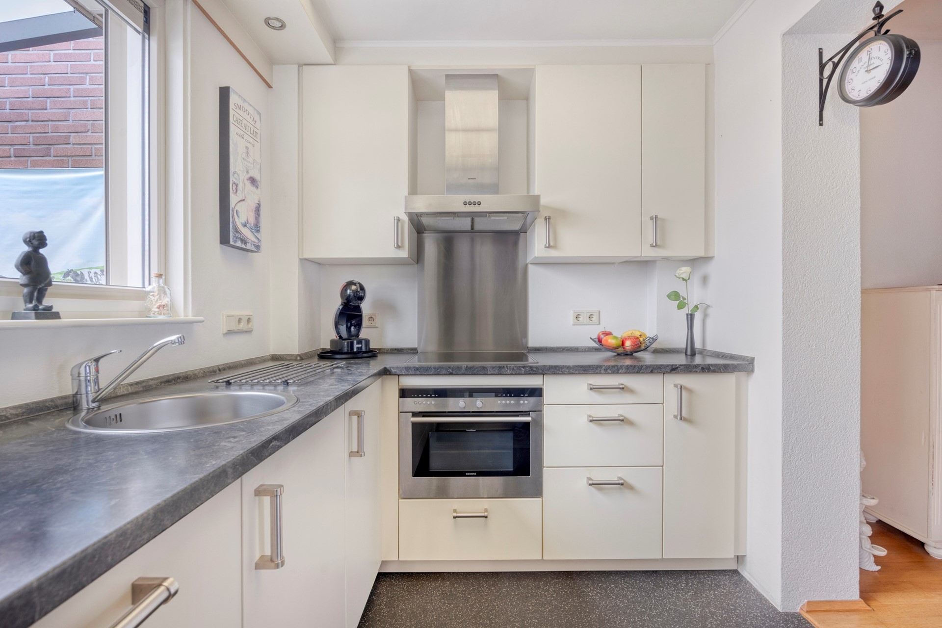 Aan de achterzijde van de woning bevindt zich de open keuken in praktische L-vormige opstelling. Deze is voorzien van een inductiekookplaat, spoelbak, vaatwasmachine, koelkast en voldoende opbergruimte in zowel lades als bovenkasten. De keuken is netjes onderhouden en instapklaar, maar biedt ook mogelijkheden om deze desgewenst naar eigen smaak te moderniseren. Vanuit de keuken heeft u directe toegang tot de tuin.